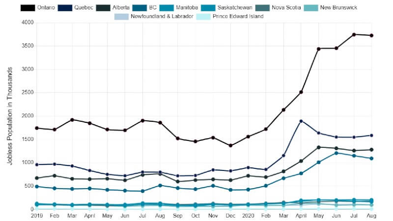 This visualization displays the total count of jobless individuals in each province during 2019 and 2020.